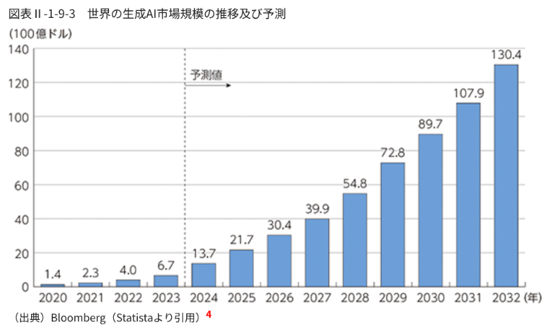 総務省が発表した令和6年版情報通信白書では、世界の生成AI市場規模の推移及び予測において2030年には現在の4倍にもなる、という推移予測を発表しています。