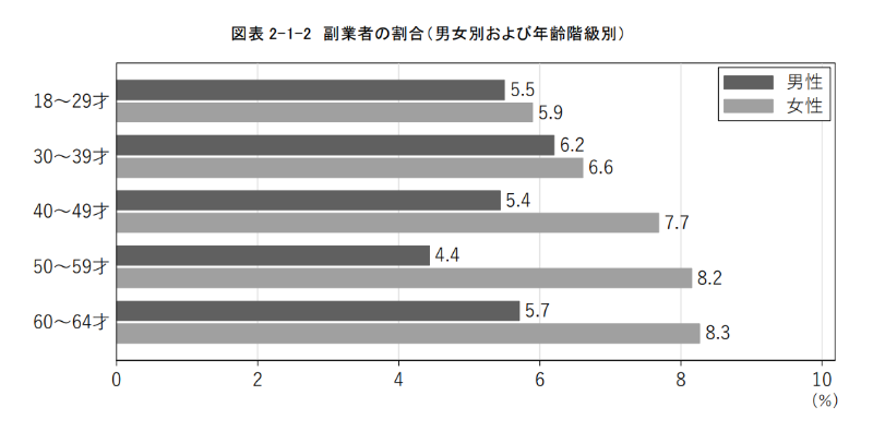 独立行政法人 労働政策研究・研修機構が2024年7月に発表した「副業者の就労に関する調査」によると、全世代で副業する女性の割合が男性よりも多い統計がありました。