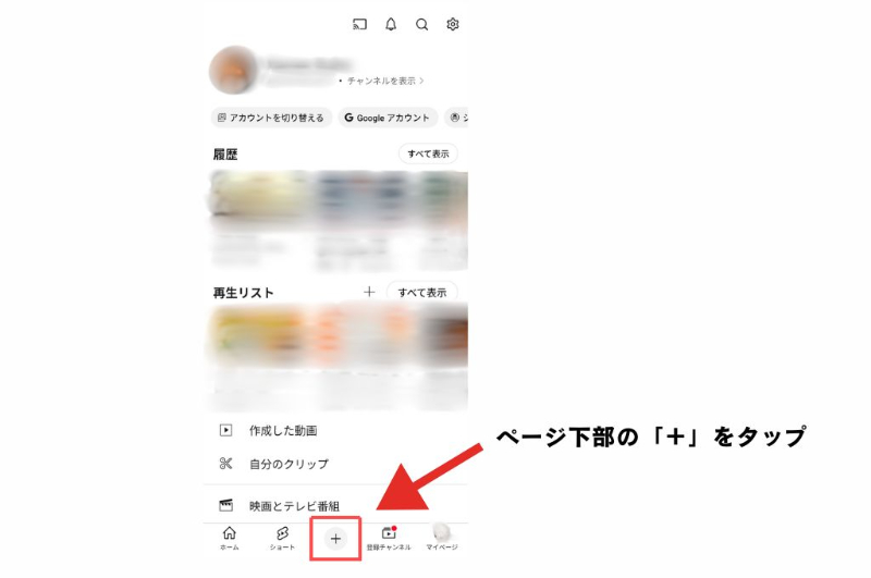 ①スマホでYouTubeアプリをひらき、下部にある「+」をタップ