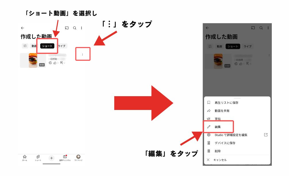 投稿後の変更はパソコンから投稿したショート動画も対象なので、パソコンから動画を投稿しても、以下同じ手順でスマホのアプリから変更が可能です。