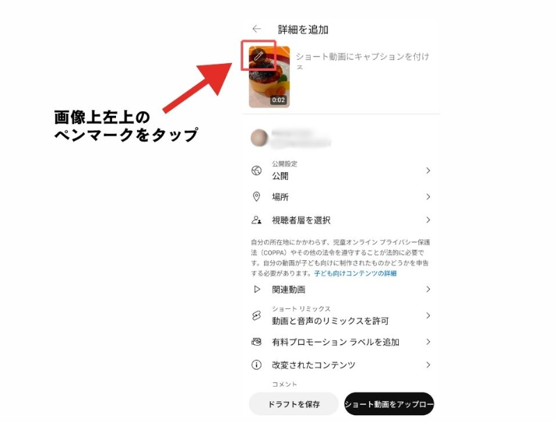 - 2.4 YouTubeショート動画のサムネイル設定の手順 ④「詳細を追加」のページで左上の画像上にあるペンマークをタップ