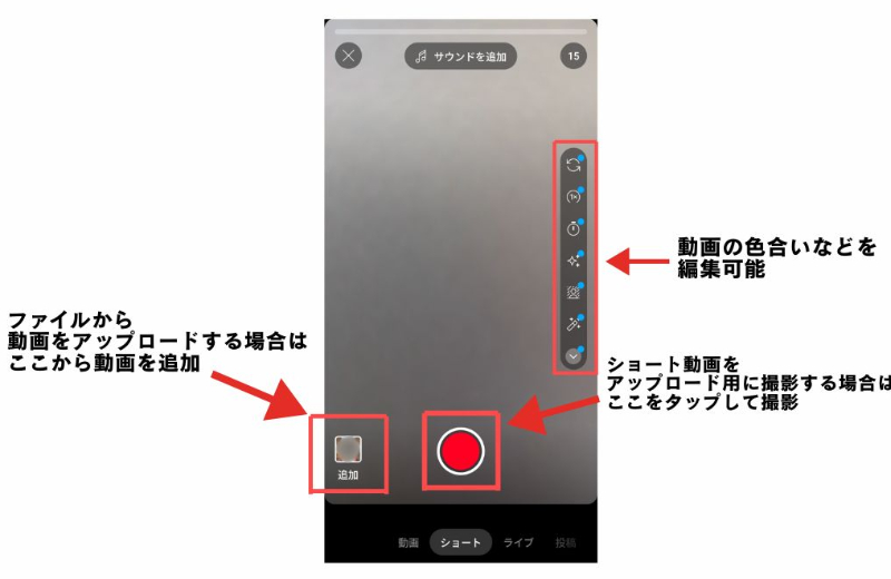 ショート動画をその場で作成して投稿したい場合は、画面下部にある赤い●ボタンをタップすると録画がはじまり、ショート動画を撮影できるようになっています。