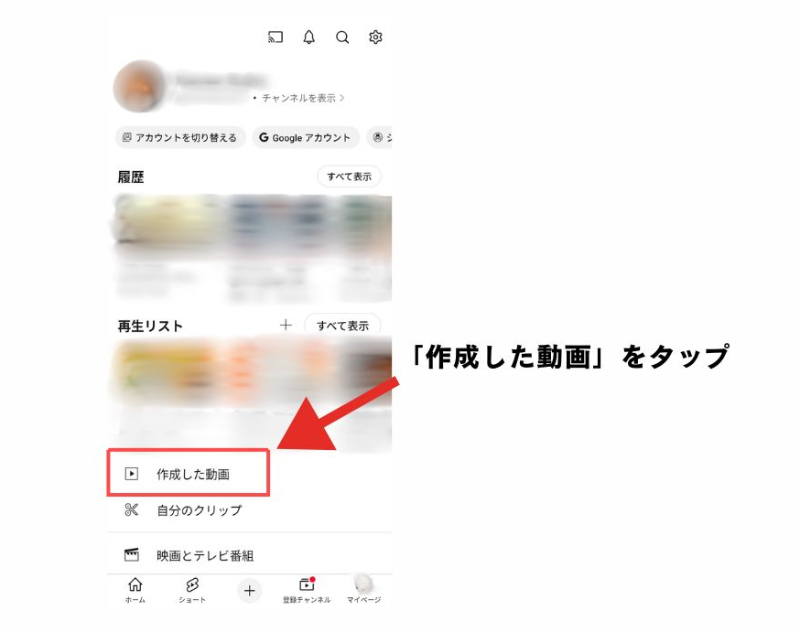 ①YouTubeのマイページから「作成した動画」へ進む