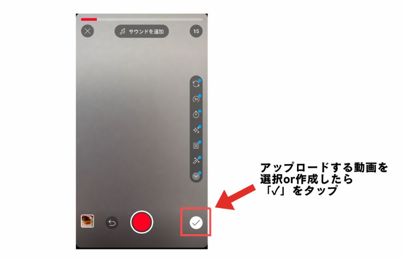 ②ショート動画を撮影or動画をアップロードし右下の「✓」をタップ