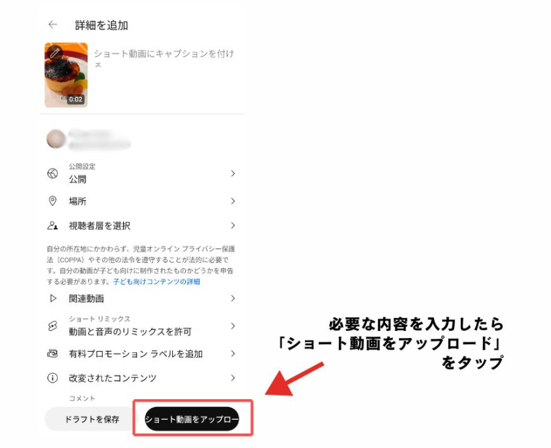 ⑥必要な詳細を入力したら右下の「ショート動画をアップロード」をタップ