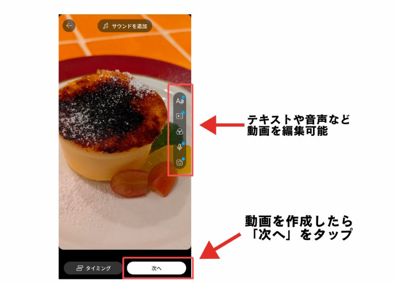 ③テキストや文字、音声などを編集し右下の「次へ」をタップ