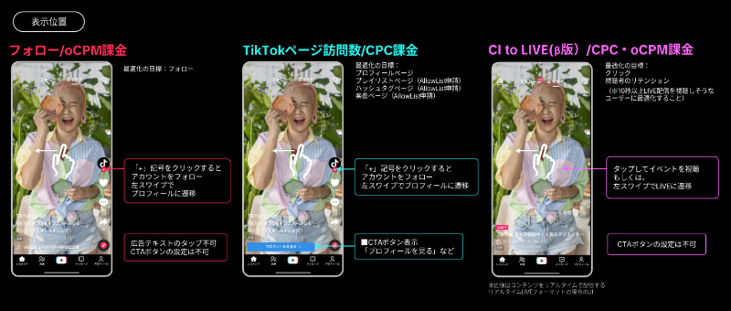 最適化インプレッション課金型(oCPM:optimized Cost Per Mille)は、通常のCPMをベースに、TikTokのアルゴリズムが広告の目的達成に最適なユーザーに広告を配信する仕組みです。