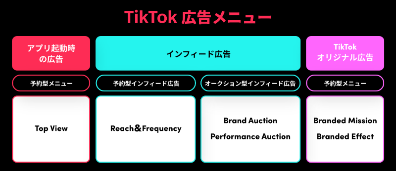 - TikTok広告には、予約型広告(純広告)と運用型広告がある