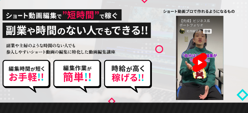 ですが、1分前後の動画が多いショート動画は、編集時間も短く済むため、通常の動画編集の仕事に挫折してしまった方にもぴったり!