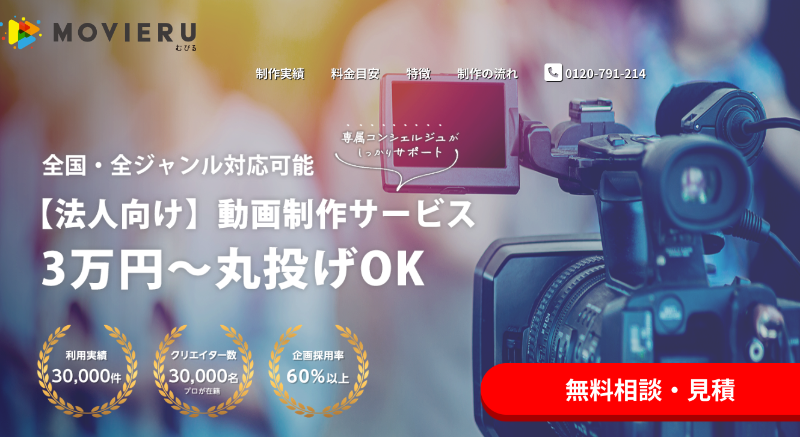 | 実績 | 全国で企業のプロモーション動画やYouTube動画、公告動画のほか、個人でのイベント動画制作、ウェディング動画制作など相談実績述べ30,000件 |